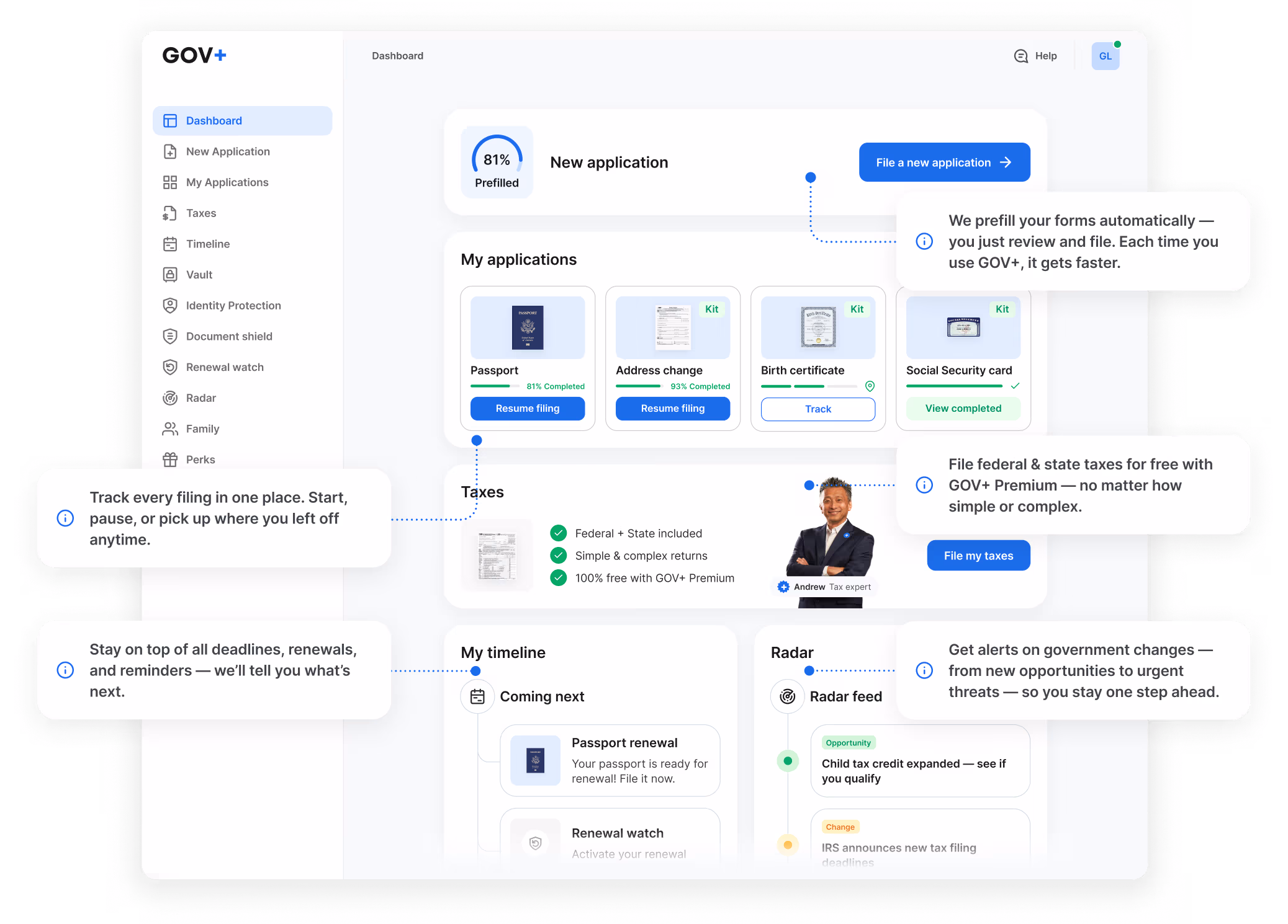 GOV+ tracks deadlines, renews documents, and alerts you all while you get on with life.